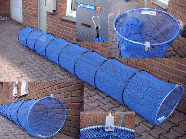 Der ultimative Setzkescher welcher alle Vorgaben der internationalen Profiszene erfüllt. Der Zammataro Alcatraz Setzkescher hat eine Länge von 4,40 m bei einem Durchmesser von 50 cm. Er wird durch 8 sinkende Vollmaterial Industrie-Kunststoffringe außenliegend gespannt, die je durch ca. 40 reissfeste Kabelbinder gehalten werden. Der Einwurfring wurde aus 10mm starkem Alu- Vollmaterial hergestellt und trifft sich in einem verwindungssicheren Alu-Block mit Universalgewinde. Der Durchmesser des Einwurfs beträgt 50 cm, kann aber auch wahlweise im Diameter 60 cm geliefert werden. Gerade für Stippfischer sollte diese Option sehr interessant sein. Das Netz besteht aus absolut unverwüstlichem und verrottungsfesten Material und sollte mindestens eine Haltbarkeit von 10 Jahren besitzen. Am Ende ist das Netz zusammengerafft und mit einem zusätzlichen Karabinerhaken zum sicheren Beschweren ausgestattet.