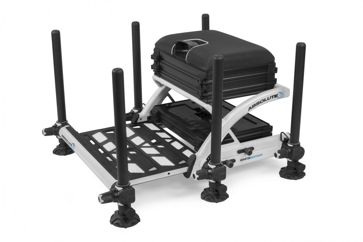 Die Preston Absolute 36 White Edition ist der absolute Eyecatcher am Wasser und bietet dem Angler alle wichtigen Features um erfolgreich eine Session zu beenden. Im Gegensatz zu den nicht erweiterbaren "Black Edition" Sietzkiepen von Preston Innovation, ist diese Box für jene Angler gedacht welche Ihre Sitzkiepe individuell nach den persönlichen Anforderungen mit Zubehör zusammenstellen wollen. Mit der robusten 30mm Beinkonfiguration, den ergonomischen Handwheel-Schraubendesign der soliden Fußplatte, die nun in allen Winkeln arretierbar ist und praktischen, dreistrahligen Schrauben zum einfachen Auf- und Abbau. Mit einem neu designten carbonfreundlichen Rutenhaltegurt und einem neuen unverlierbaren internen-Bein-Design.Ein abnehmbarer Schultergurt und Gewinde-Einsätze an zwei der sechs Beine, kompplettieren die Ausstattung. Mit ihrer weißen Farbe und dem Kontrast durch die grafischen Elemente und Bauteile, ist dies die Box, die man am Ufer sehen wird.